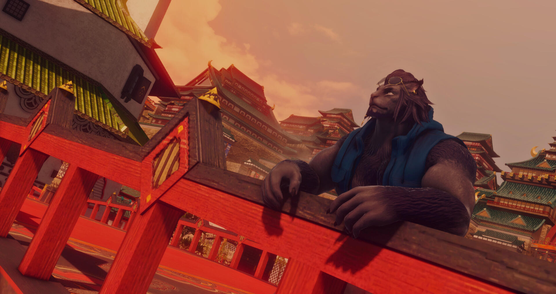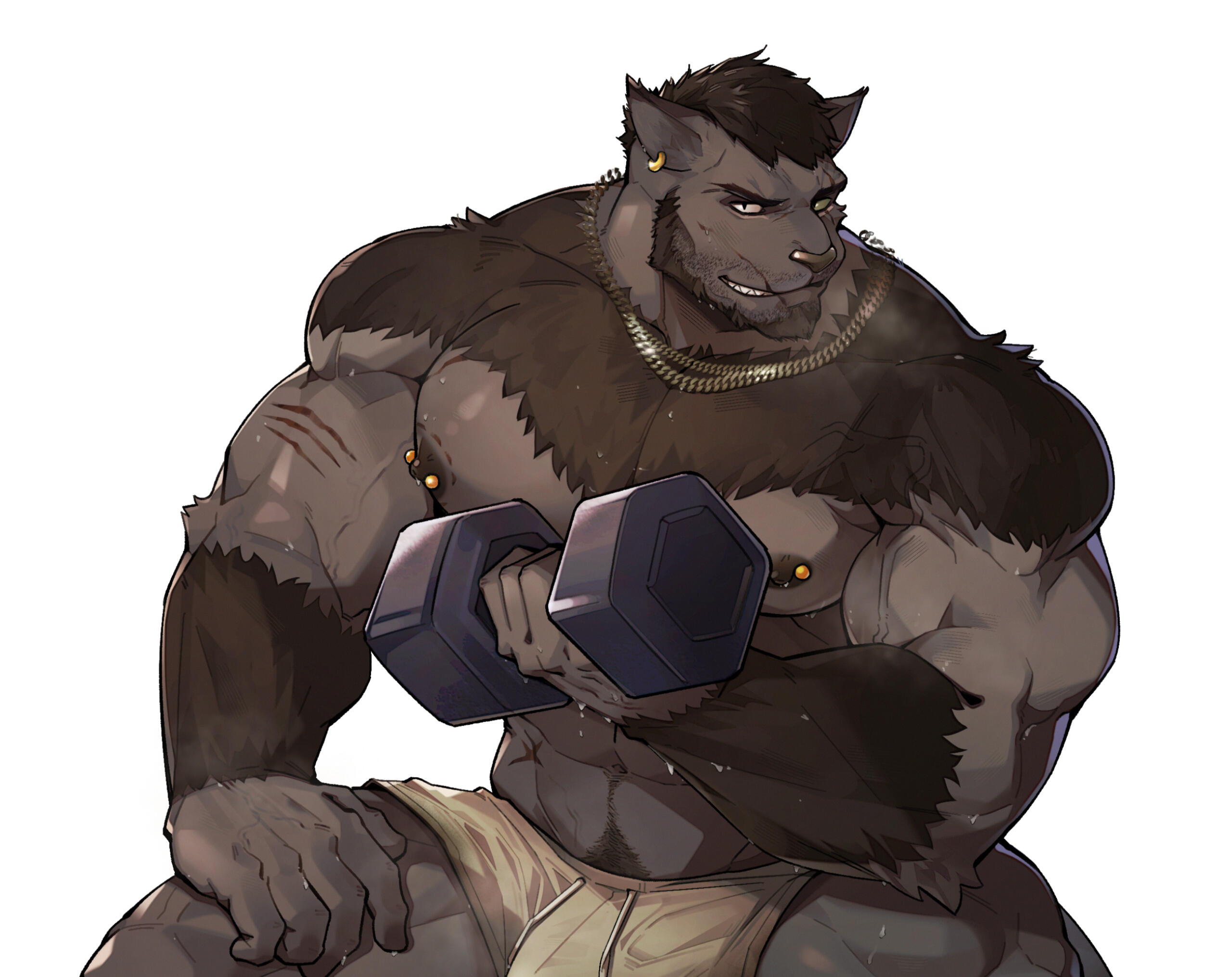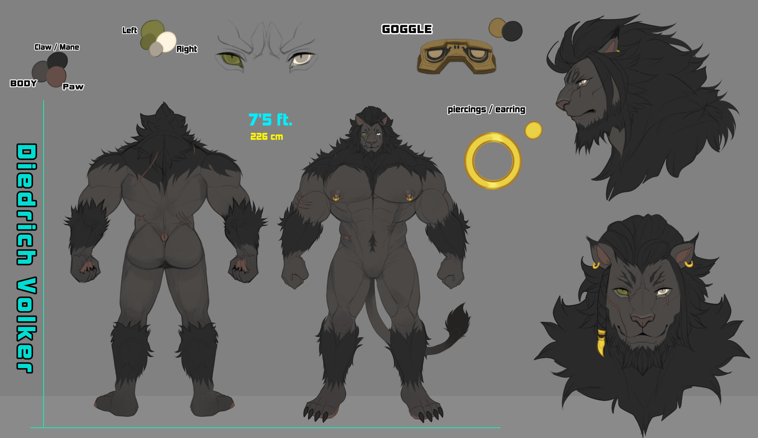 A veritable mountain of a man, Diedrich stands tall and proud, significantly taller than the average Hrothgar.His mane is a jet black sort of colour, short in the front and shaved in the back for ease of work. His eyes are dual colored, the right a grassy sort for green and the left a piercing white. His beard as is well kept as his hair. Trimmed short, it goes along his jaw and chin, trailing down towards his Adam's apple before tapering out, though lately he's been getting lazy and you'll find him with a dusting of stubble along his cheeks and beneath his chin. A messy looking scar carves through his left brow down to his left cheek. Another jagged scar cuts diagonally across his other cheek, nearly spanning the length of it. There is also a small mostly vertical scar on his snout, close to the hollow of his right eye. Despite its scars, most seem to believe his face is well formed and handsome by Hrothgar standards.Years of hard work and equally hard travel have given him a sturdy, toned physique peppered with a myriad of scars ranging from random claw-like scars earned from beasts long since slain to age old puncture wounds, slashes and more; the man has clearly seen his fair share of conflict and is no stranger to pain. His arms are thick and powerful; his broad, muscular chest covered with a thick layer of fluffy, well-kept fur that thins slightly as it trails down to his defined abs before appearing again as it nears his groin.His paws are calloused and rough, but mostly untouched as far as scars go. He always wears his engagement ring no matter what.Leg day isn't something he skips. Every day is leg day for a weak aethered man who loathes to step aboard airships. Though just as muscular as the rest of him, it seems like his rump hoards most of the fat in his body to itself in a pleasantly proportional way. Long story short, when he wears pants, he fills them all the way out, front and back alike.He takes great pride in his appearance and makes sure to work out when he isn't working or traveling just to make sure he's maintaining his figure.