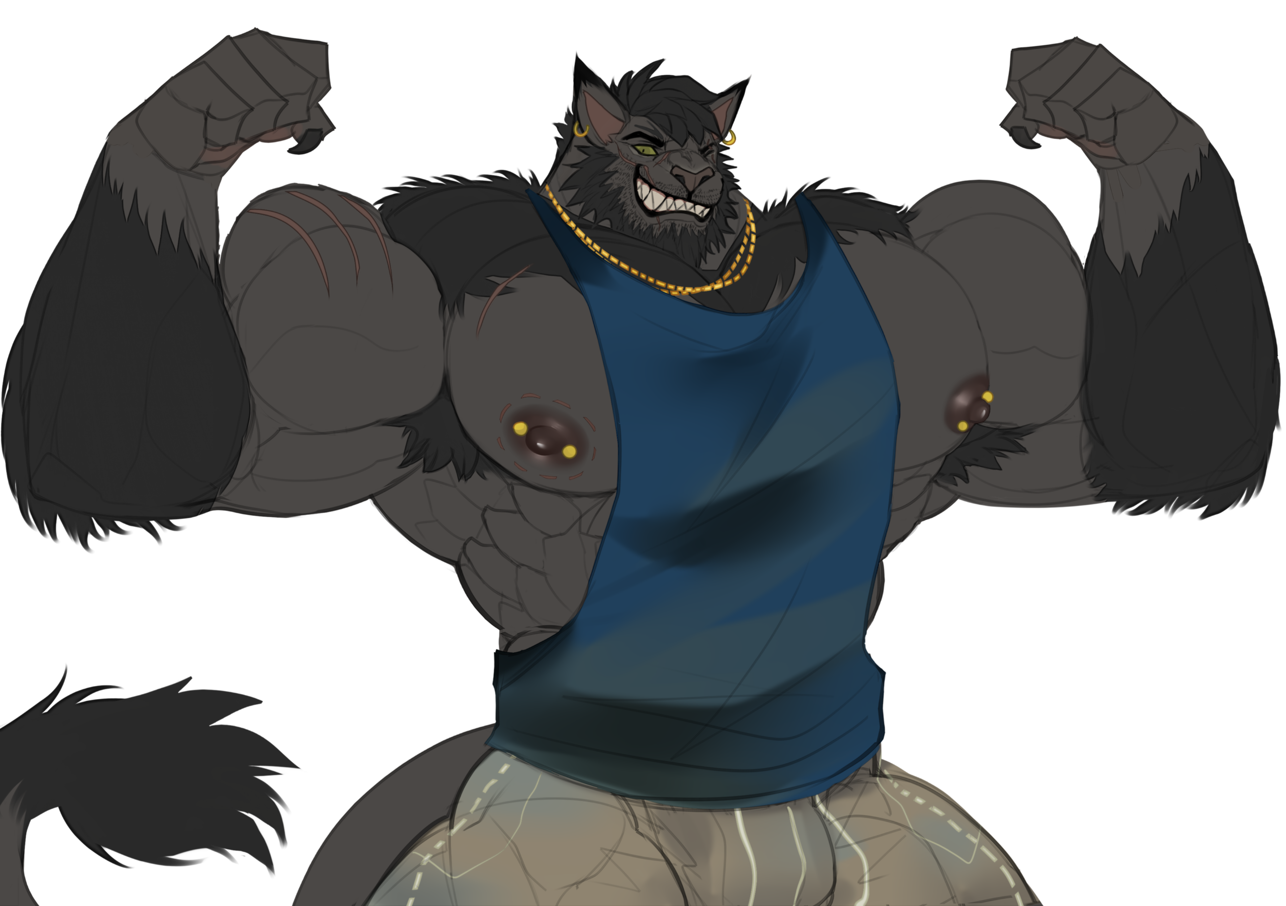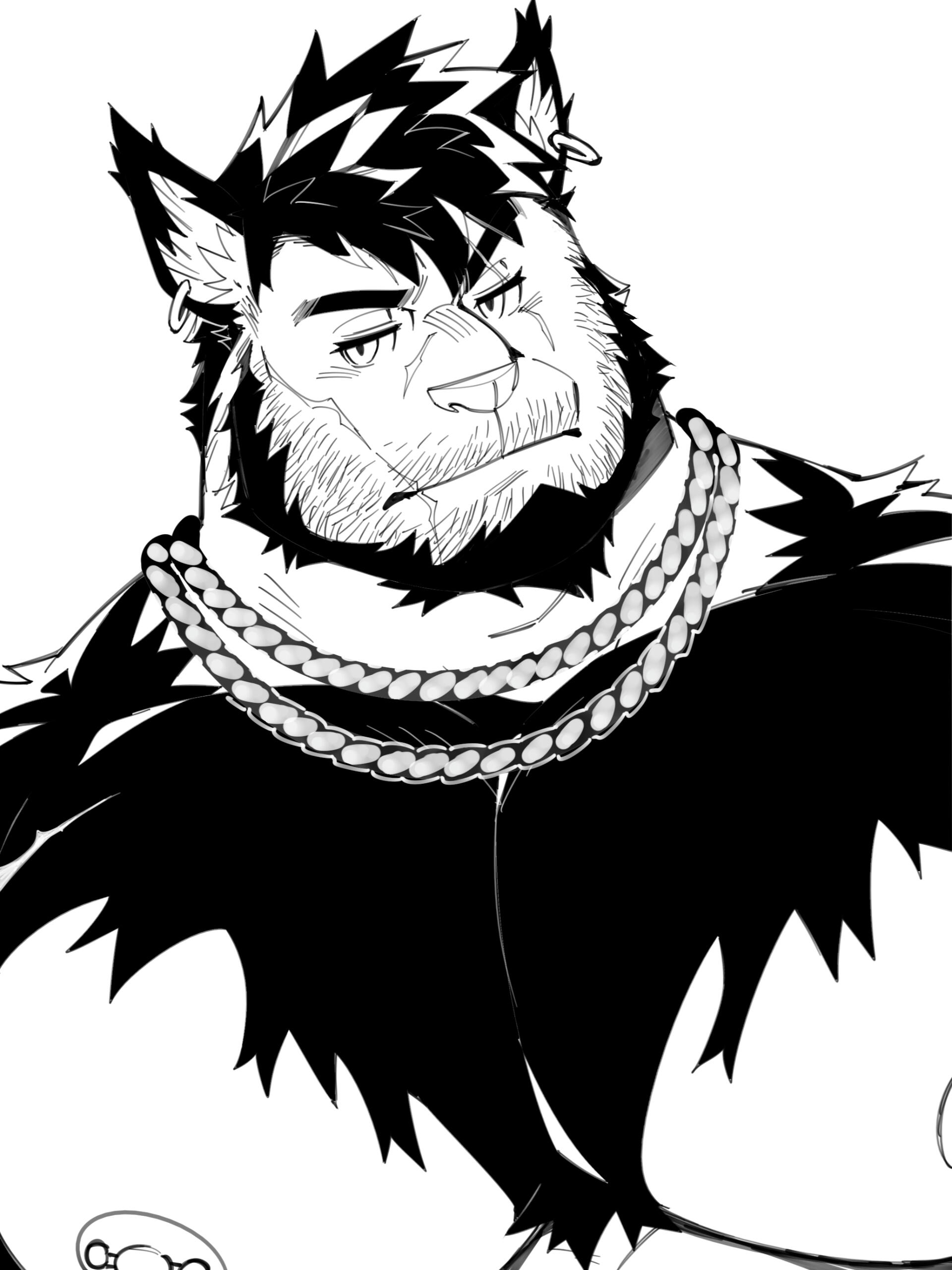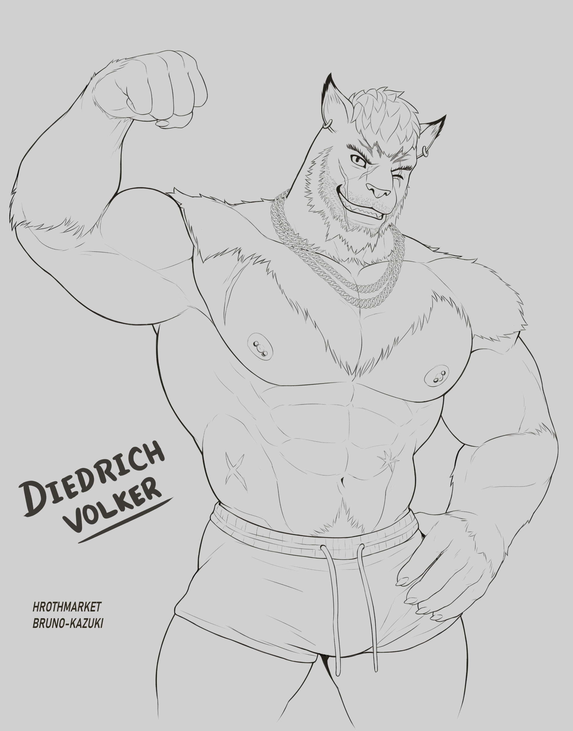 A veritable mountain of a man, Diedrich stands tall and proud, significantly taller than the average Hrothgar.His mane is a jet black sort of colour, short in the front and shaved in the back for ease of work. His eyes are dual colored, the right a grassy sort for green and the left a piercing white. His beard as is well kept as his hair. Trimmed short, it goes along his jaw and chin, trailing down towards his Adam's apple before tapering out, though lately he's been getting lazy and you'll find him with a dusting of stubble along his cheeks and beneath his chin. A messy looking scar carves through his left brow down to his left cheek. Another jagged scar cuts diagonally across his other cheek, nearly spanning the length of it. There is also a small mostly vertical scar on his snout, close to the hollow of his right eye. Despite its scars, most seem to believe his face is well formed and handsome by Hrothgar standards.Years of hard work and equally hard travel have given him a sturdy, toned physique peppered with a myriad of scars ranging from random claw-like scars earned from beasts long since slain to age old puncture wounds, slashes and more; the man has clearly seen his fair share of conflict and is no stranger to pain. His arms are thick and powerful; his broad, muscular chest covered with a thick layer of fluffy, well-kept fur that thins slightly as it trails down to his defined abs before appearing again as it nears his groin.His paws are calloused and rough, but mostly untouched as far as scars go. He always wears his engagement ring no matter what.Leg day isn't something he skips. Every day is leg day for a weak aethered man who loathes to step aboard airships. Though just as muscular as the rest of him, it seems like his rump hoards most of the fat in his body to itself in a pleasantly proportional way. Long story short, when he wears pants, he fills them all the way out, front and back alike.He takes great pride in his appearance and makes sure to work out when he isn't working or traveling just to make sure he's maintaining his figure.