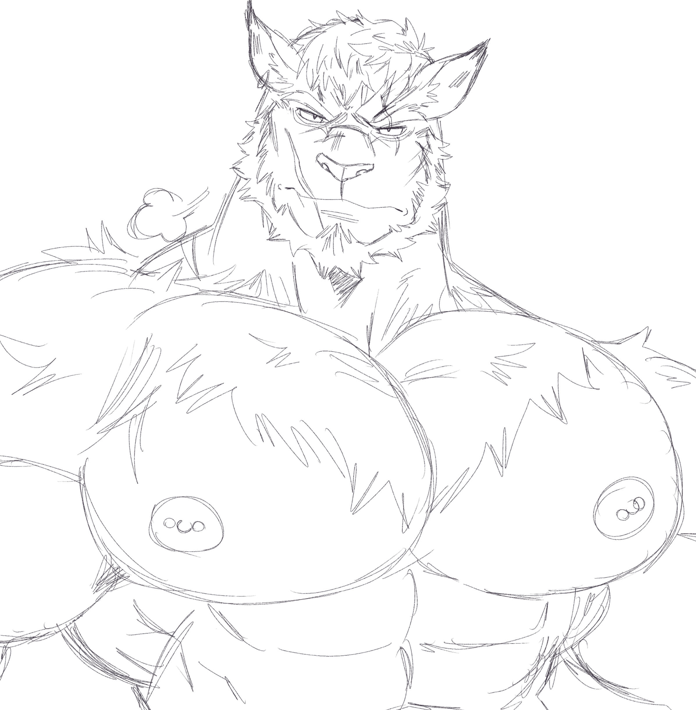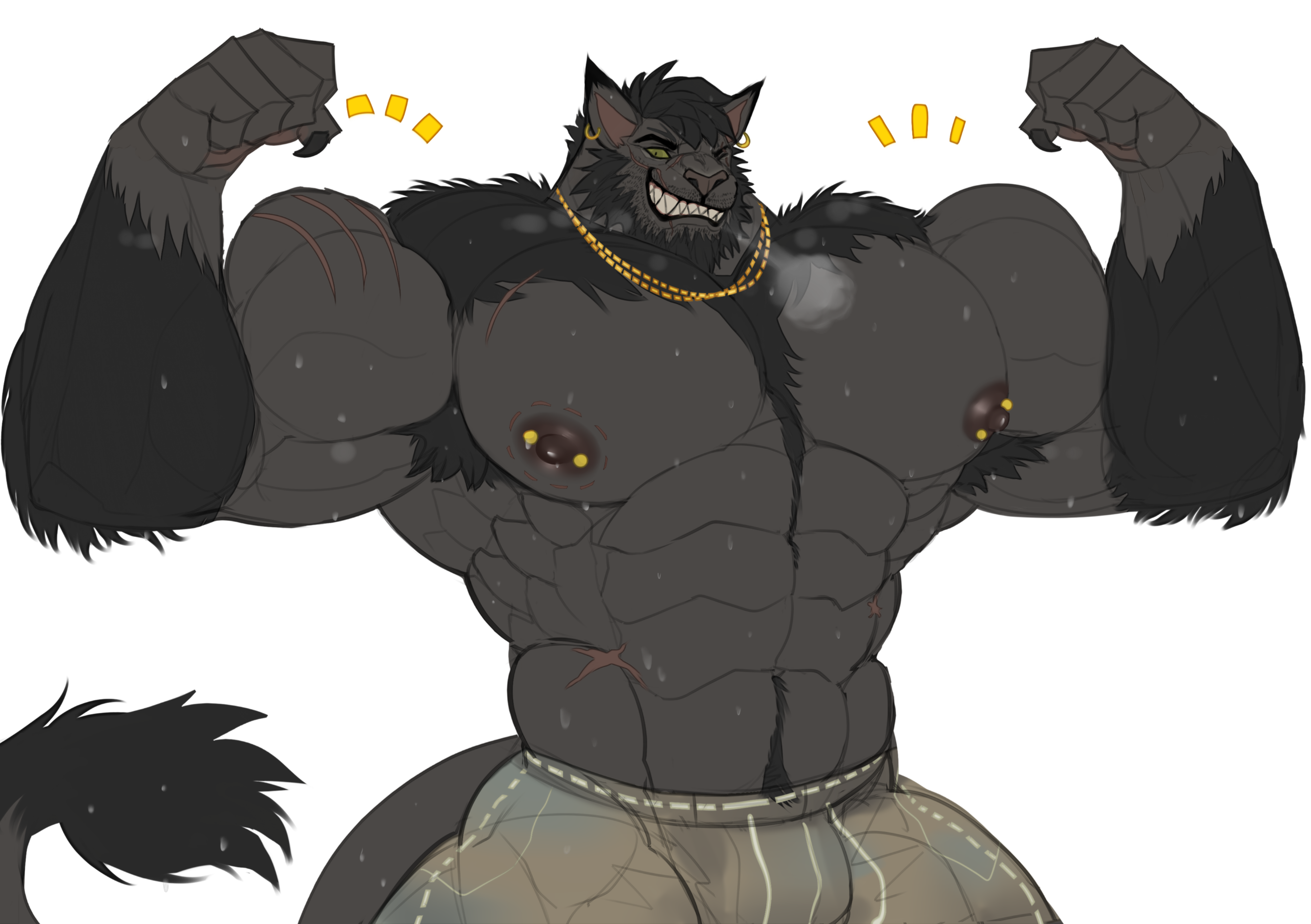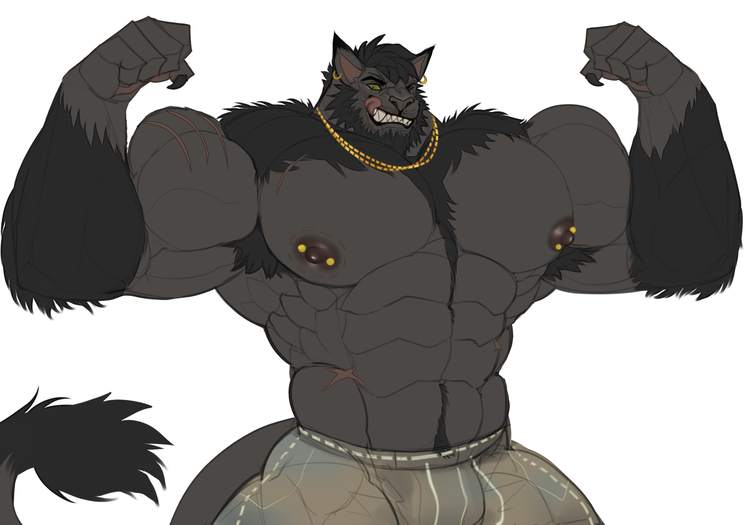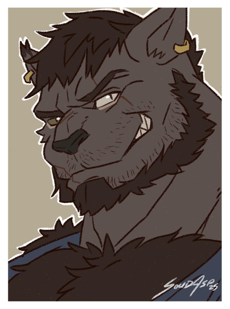 A veritable mountain of a man, Diedrich stands tall and proud, significantly taller than the average Hrothgar.His mane is a jet black sort of colour, short in the front and shaved in the back for ease of work. His eyes are dual colored, the right a grassy sort for green and the left a piercing white. His beard as is well kept as his hair. Trimmed short, it goes along his jaw and chin, trailing down towards his Adam's apple before tapering out, though lately he's been getting lazy and you'll find him with a dusting of stubble along his cheeks and beneath his chin. A messy looking scar carves through his left brow down to his left cheek. Another jagged scar cuts diagonally across his other cheek, nearly spanning the length of it. There is also a small mostly vertical scar on his snout, close to the hollow of his right eye. Despite its scars, most seem to believe his face is well formed and handsome by Hrothgar standards.Years of hard work and equally hard travel have given him a sturdy, toned physique peppered with a myriad of scars ranging from random claw-like scars earned from beasts long since slain to age old puncture wounds, slashes and more; the man has clearly seen his fair share of conflict and is no stranger to pain. His arms are thick and powerful; his broad, muscular chest covered with a thick layer of fluffy, well-kept fur that thins slightly as it trails down to his defined abs before appearing again as it nears his groin.His paws are calloused and rough, but mostly untouched as far as scars go. He always wears his engagement ring no matter what.Leg day isn't something he skips. Every day is leg day for a weak aethered man who loathes to step aboard airships. Though just as muscular as the rest of him, it seems like his rump hoards most of the fat in his body to itself in a pleasantly proportional way. Long story short, when he wears pants, he fills them all the way out, front and back alike.He takes great pride in his appearance and makes sure to work out when he isn't working or traveling just to make sure he's maintaining his figure.